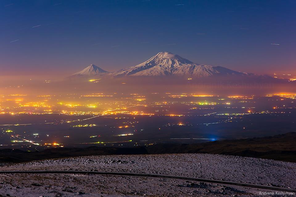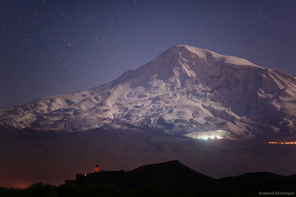 Ararat—located some 65 km (40 mi) south of the city–dominates the skyline of Armenia's capital Yerevan.